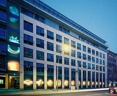 Five vertical and 13 horizontal window segments, doubling as video screens, partition the facade of the former Vereinigte Energiewerke AG (VEAG) building and form a near- autonomous L-form. Activated by pulses of light objects emerge, quoting the surface aesthetics of trivial consumer goods. Their shapes flow between the windows from top to bottom and from left to right, burn up to arise again. Referring to the specifity of the location energy cycles as a universal principle, which allow transformations of form into form are accommodated in a symbolic and conceptual framework.